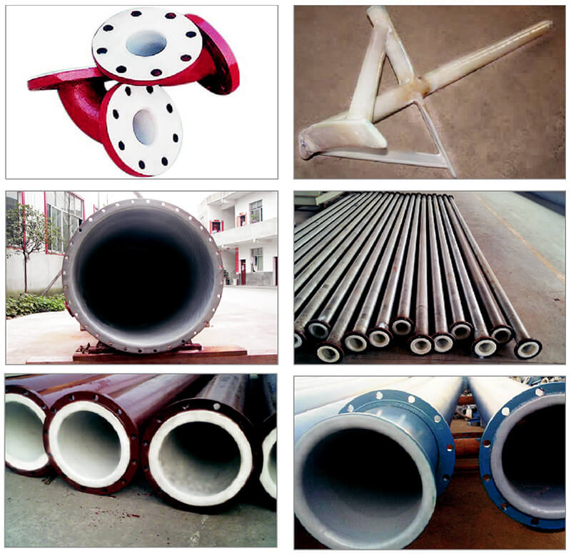 公司PE(PO)襯里采用的原材料是進(jìn)口粉末狀的線性低密度聚乙烯(LLDPE),它的加工方法為旋轉(zhuǎn)成型,工件(鋼制容器或管道)在旋轉(zhuǎn)的過(guò)程中加熱,粉狀樹(shù)脂的工作表面吸熱熔融,旋轉(zhuǎn)一次便粘上一層粉狀樹(shù)脂,隨即吸熱融化,最后加工至規(guī)格厚度后冷卻成型,所以它在工藝上保證了襯層無(wú)針孔、無(wú)泄漏、無(wú)任何焊縫。并且該工藝對(duì)工件的內(nèi)外結(jié)構(gòu)無(wú)要求,無(wú)論結(jié)構(gòu)如何復(fù)雜,均能加工成型。在工件較大,運(yùn)輸有困難的情況下還可以現(xiàn)場(chǎng)施工,使用溫度在100℃以內(nèi),在酸、堿、鹽等強(qiáng)腐蝕介質(zhì)中能長(zhǎng)期穩(wěn)定使用,廣泛用于冶金、化工、制藥、食品、環(huán)保、能源等行業(yè)中接觸腐蝕介質(zhì)的管道、槽、罐、塔、風(fēng)機(jī)、交換器、攪拌槳、閥門等。